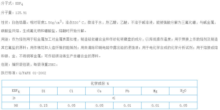 分子式:KBF 4 分子量:125.91 性狀:白色結晶。相對密度2.50g/cm 3 。溶點(diǎn)530C,微溶于水,熱乙醇,乙醚,不溶于堿溶液,能被強酸分解為三氟化硼,與堿金屬,碳酸鹽共熔,生成氟化物和...